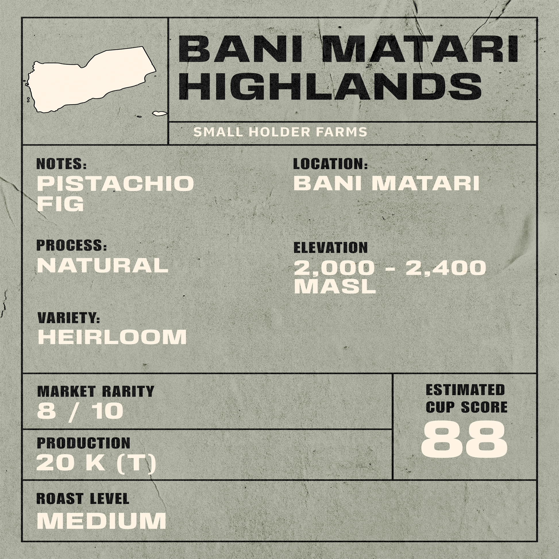 Yemen is one of the birthplaces of the global coffee trade, where cultivation dates back hundreds of years and coffee first moved through the legendary port of Mokha to reach the rest of the world. Unlike many modern producing countries, coffee in Yemen is still grown much as it always has been, on steep, hand-built terraces in dry, mountainous regions, without large-scale industrial farming. Over generations, farmers have preserved diverse heirloom varieties, giving Yemeni coffee its unmistakable depth and identity.
